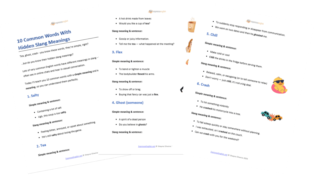 If you want to understand movies, social media, conversations, and jokes without guessing, check out my Slang & Informal English e-book. It explains hundreds of expressions clearly, simply, and naturally. You’ll also find out when to use them – and when not to use them.