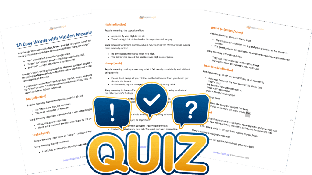 In todayâs video, weâre going to look at 10 common English words with surprising double meanings â the kind native speakers use in slang or informal English conversation all the time. If you want to understand real English in movies, music, and everyday speech â youâll love this one. And you can download todayâs lesson PDF – with a bonus quiz. Give it a try to see if you fully understand all these English words with their hidden meanings.