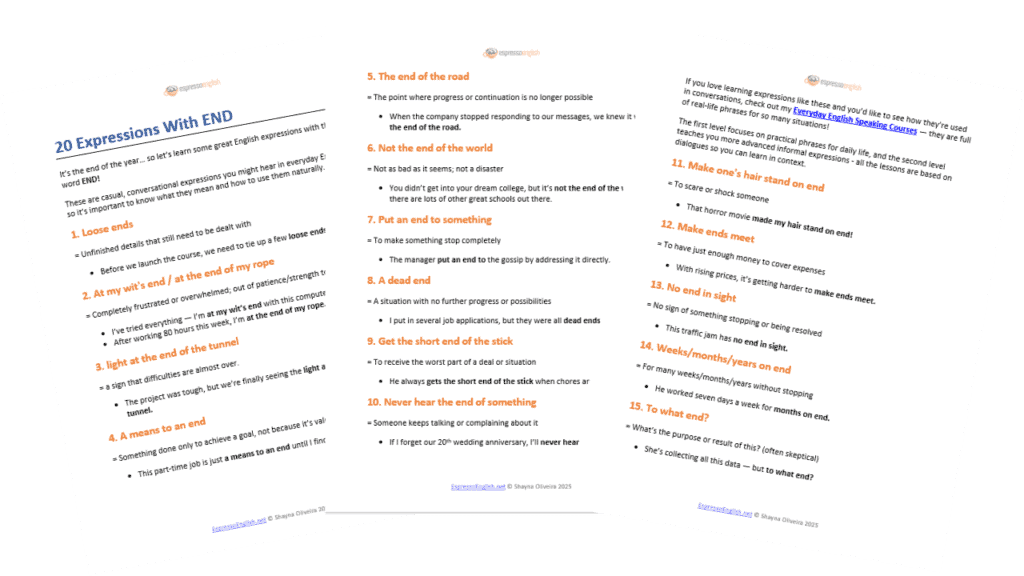 I bet you didn’t know the word “end” could be used in so many different ways – but now you know 20 new expressions… and what better time to learn them than at the end of the year!