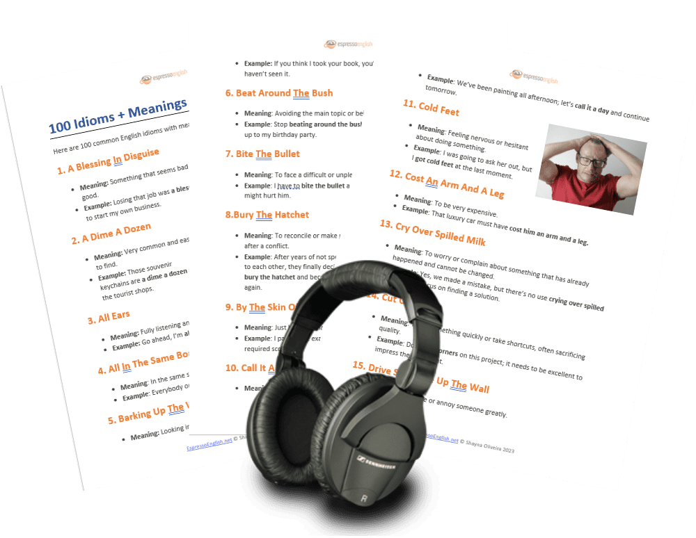 If you’d love to learn even more of these, my free gift to you is a downloadable list of 100 idioms, all with meanings and examples.