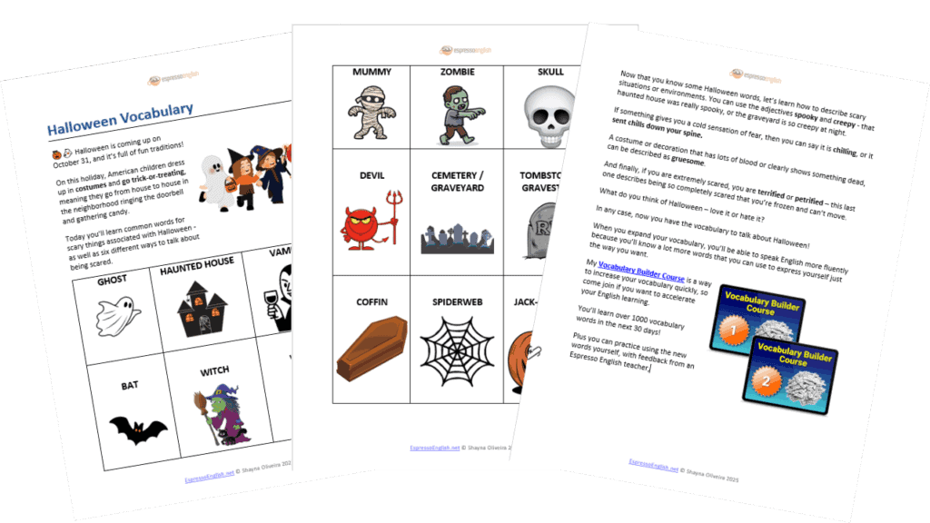 Today you’ll learn Halloween vocabulary – common words for scary things associated with this holiday – as well as six different ways to talk about being scared.