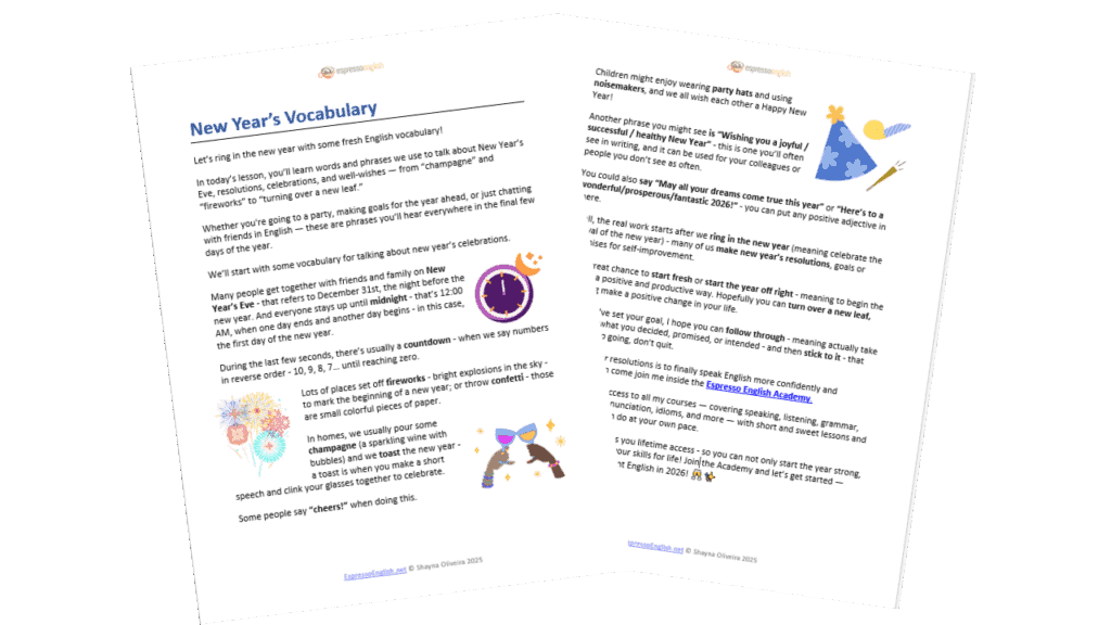 In today’s lesson, you’ll learn words and phrases we use to talk about New Year’s Eve, resolutions, celebrations, and well-wishes — from “champagne” and “fireworks” to “turning over a new leaf.”