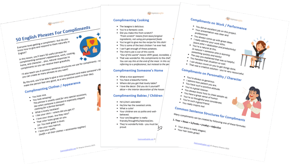 I’ll also teach you 4 common sentence structures we use for compliments in English – so that you can create as many phrases as you want!