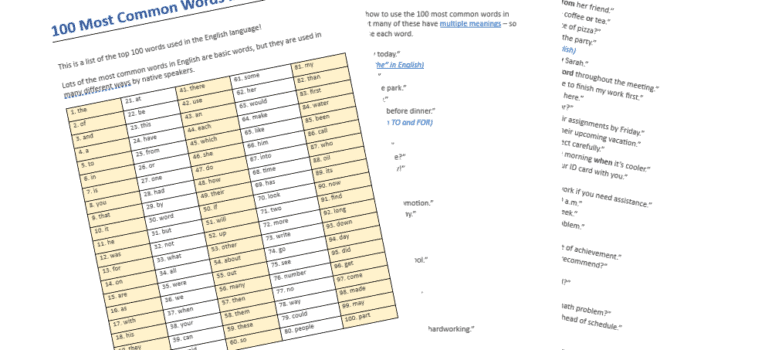 Do you know the most common English words? This is a list of the top 100 words used in the English language! Many of the most common words in English are basic words, but they are used in many different ways by native speakers. Here’s a list of the 100 most common words in English, … Continue reading The 100 most common words in English