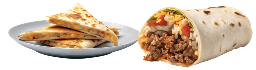 Some Mexican food items are also popular, such as a quesadilla (melted cheese inside a flat tortilla, we can also add veggies or chicken) and a burrito, with rice, beans, and meat rolled up inside.