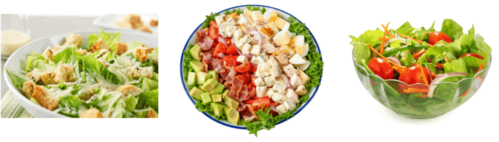 If you don’t like sandwiches, maybe you’d prefer a soup and salad for lunch – here are a few common ones. A Caesar salad has lettuce, croutons, parmesan cheese, and a creamy dressing. A Cobb salad is topped with chicken, bacon, eggs, tomatoes, and blue cheese. A garden salad is a little lighter – just leafy greens and fresh vegetables.