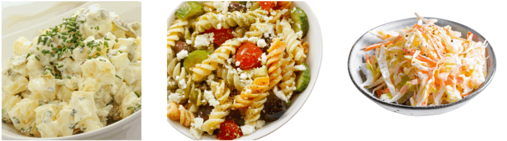 We also have potato salad, which mixes chunks of potatoes with mayonnaise, and pasta salad, which is served cold or at room temperature with a dressing. Those two are usually eaten as side dishes, as well as coleslaw, which is shredded cabbage and maybe carrots, in a creamy dressing.