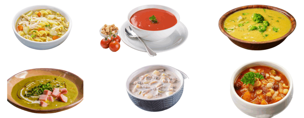 A few common soups in the U.S. are chicken noodle soup, which has chicken and noodles of course, and maybe celery and carrots. Tomato soup, broccoli cheddar soup, split pea soup (which may also contain ham or bacon), clam chowder – a creamy soup made with clams, potatoes, and onions – and minestrone soup, which has various vegetables, beans, and pasta, often in a tomato-based broth.