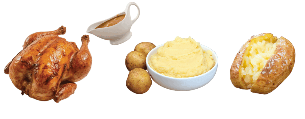 Now let’s learn some common American dinner foods. We can have roast chicken or turkey, which is made in the oven, and serve it with gravy – a sauce with extra flavor. This could be served with mashed potatoes or a baked potato.