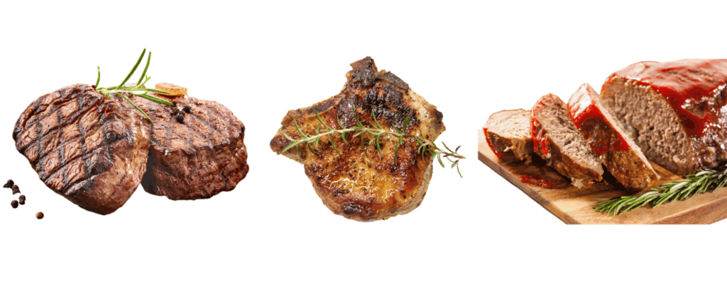 Other meat options include steak, pork chops, or meatloaf (that’s ground meat mixed with eggs and breadcrumbs baked and cut into slices).