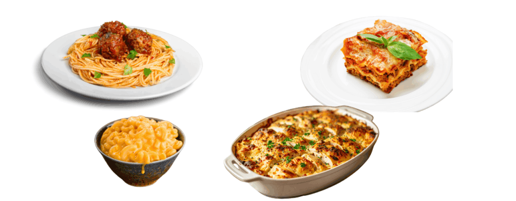 Some common pasta dishes are spaghetti with meatballs, lasagna, and my kids’ favorite, macaroni and cheese. There are many different kinds of casseroles – a casserole can have pasta, rice, or potatoes, meat or chicken, vegetables, and a sauce, all baked together in one dish.