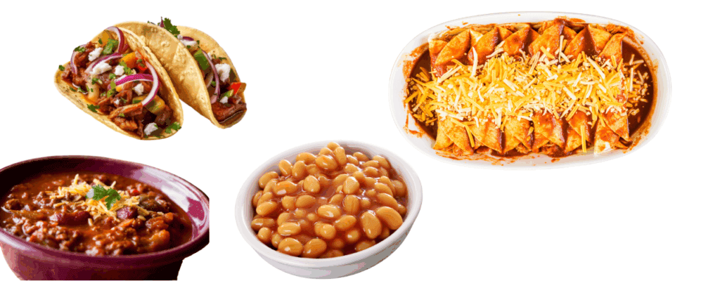 We also have Mexican-inspired dinner foods like tacos, enchiladas (which are baked in the oven), and chili – a spicy stew with ground meat, tomatoes, and often beans. One classic American dish is baked beans, which are cooked in a tomato-based sauce that’s slightly sweet – this is usually served as a side dish, especially during the 4th of July holiday when many people have cookouts.