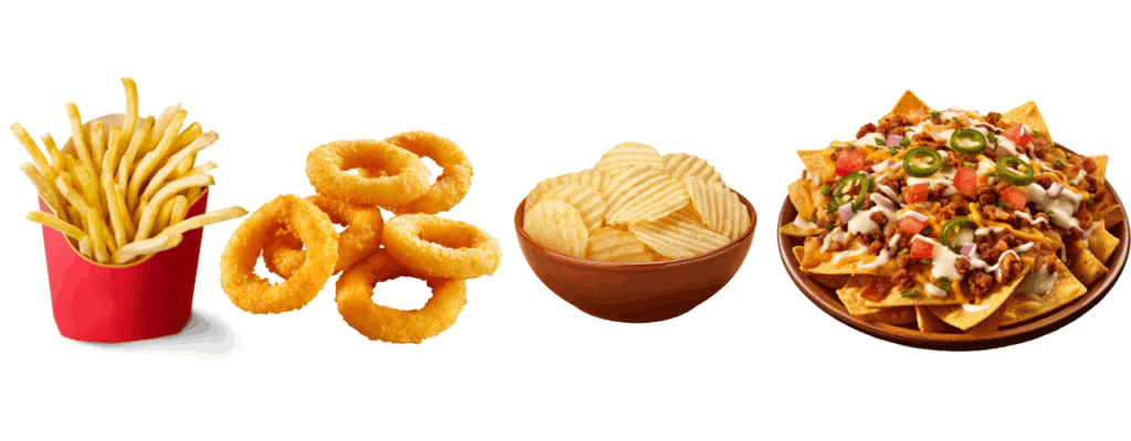 How about some common American snacks and fast foods? This is what we’re known for, right? There’s French fries, onion rings, potato chips, and nachos (topped with cheese, salsa, and jalapeno peppers).