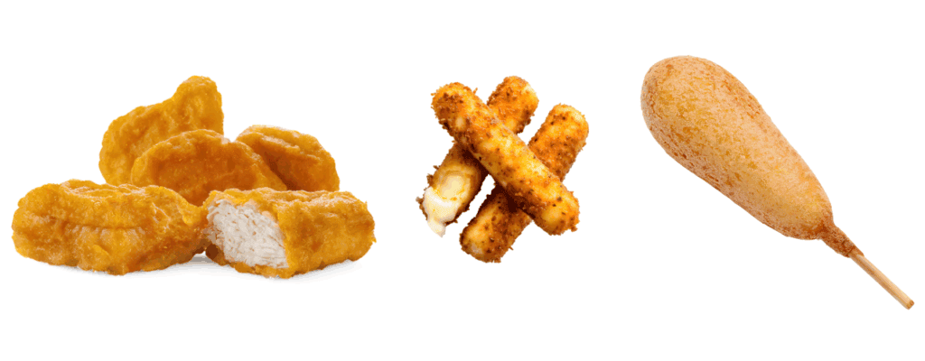 Some common kids’ foods are chicken nuggets and mozzarella sticks, which are both coated with breading and can be dipped in ketchup or another sauce, as well as a corn dog – that’s a hot dog on a stick coated in cornmeal batter and deep fried. Have you ever tried any of these? Let me know.