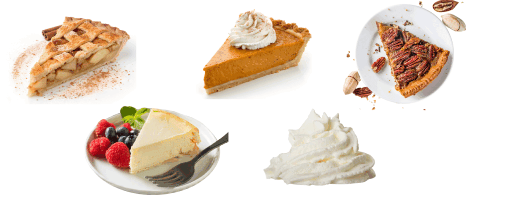 Finally, some classic American desserts – the first one that comes to mind is apple pie. There’s also pumpkin pie, which we usually eat at Thanksgiving, pecan pie, and cheesecake. These can all be topped with whipped cream.