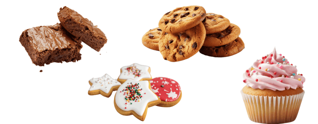 Brownies are a kind of baked chocolate bar, they’re denser than a cake. We’ve also got chocolate chip cookies, sugar cookies (which are common at Christmas as we decorate them with icing) and cupcakes.