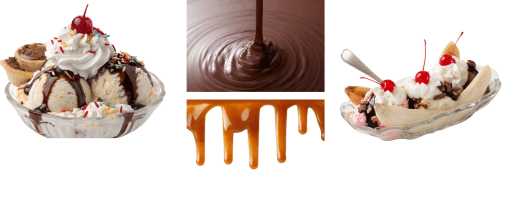 If you want something cold, you can get an ice cream sundae – which has lots of toppings, including hot fudge or caramel – or a banana split, ice cream with bananas, whipped cream, and a cherry on top.