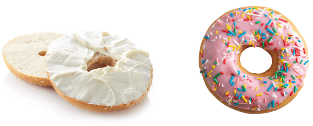 We’ve also got bagels, which have a hole in the middle – you can spread cream cheese on top of those. And the sweet version is a donut, which may have frosting and sprinkles.