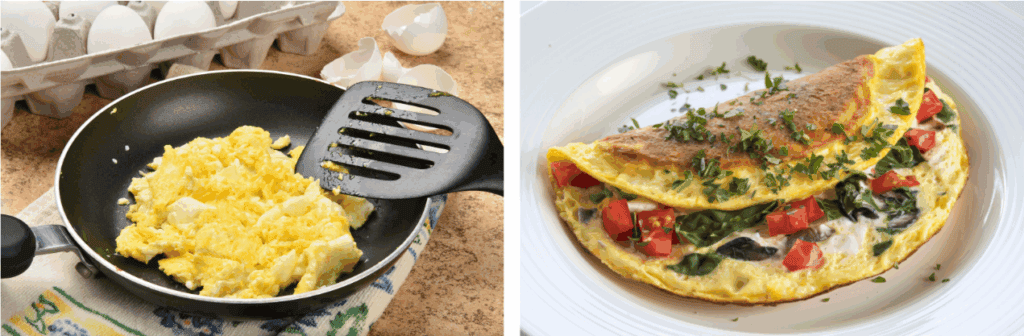 Here are some breakfast foods we cook: there’s scrambled eggs, or you can add cheese, veggies, or ham to make an omelet.