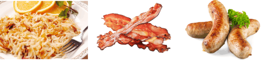 Hash browns are fried shredded potatoes, and for meat we have bacon or sausages.
