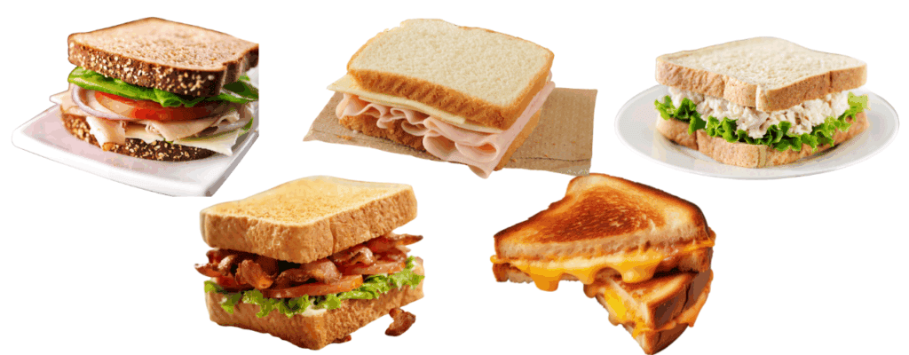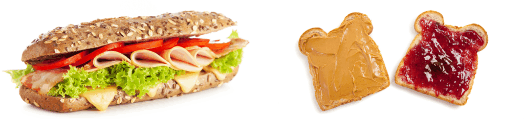 This type of sandwich that’s on a long rounded piece of bread is called a sub, and it can be filled with ham, turkey, cheese, or even something hot like meatballs. Kids often eat a peanut butter and jelly sandwich.