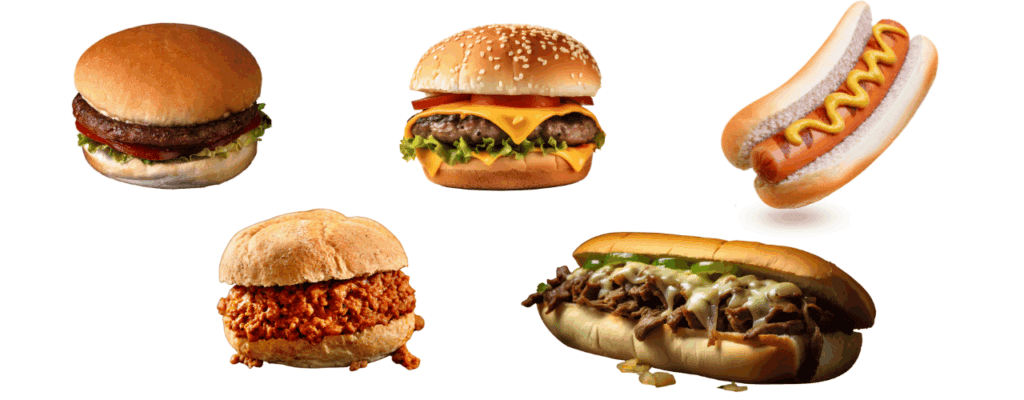 You probably already know about hamburgers, cheeseburgers, and hot dogs… but a few you might not be familiar with are a sloppy joe – that’s a hamburger bun filled with ground beef in tomato sauce, and it is quite messy to eat – and a Philly cheese steak, that’s filled with thin-sliced steak, melted cheese, and sometimes onions and peppers.