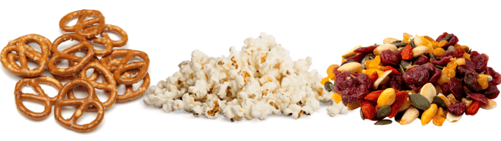 If you’re lookng for something crunchy, we’ve got pretzels, popcorn, and trail mix, which is nuts, dried fruit, and sometimes chocolate chips.