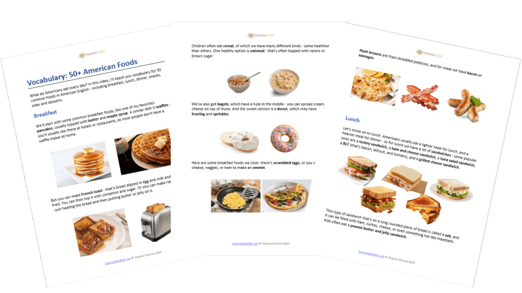 What do Americans eat every day? In this video, I’ll teach you English vocabulary for 50 common American foods – including breakfast, lunch, dinner, snacks, sides and desserts.