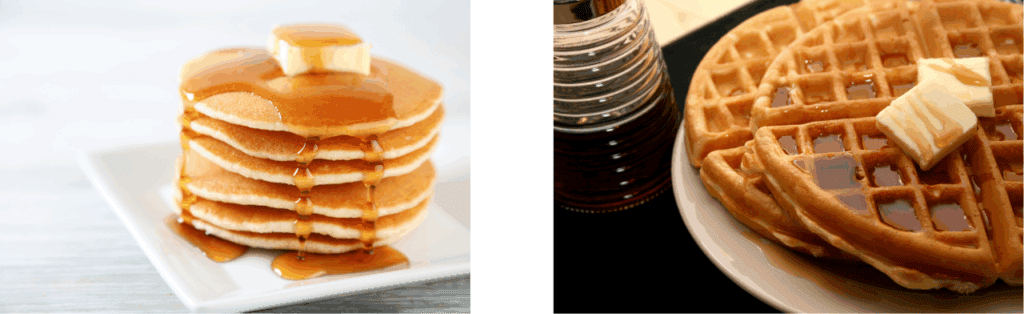 We’ll start with some common breakfast foods, like one of my favorites: pancakes, usually topped with butter and maple syrup. A similar dish is waffles – you’ll usually see these at hotels or restaurants, as most people don’t have a waffle maker at home.